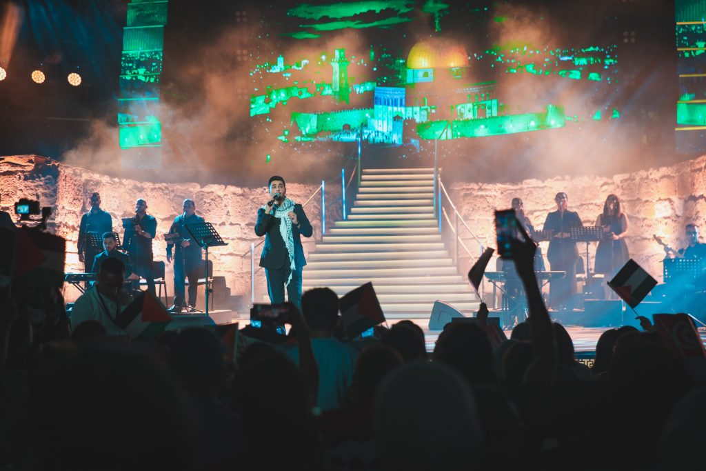 L’artiste palestinien Mohamed Assaf a brisé ce soir le silence afin de chanter pour sa ville natale Gaza après environ deux ans d’absence sur la scène artistique, et ce, dans le cadre de la sixième soirée de la 59ème édition du Festival International de Carthage en présence de la ministre des affaires culturelles, Amina Srarrfi. Un nombre de blessés palestiniens venus de Gaza pour recevoir des soins médicaux en Tunisie ont assisté aussi à ce spectacle.