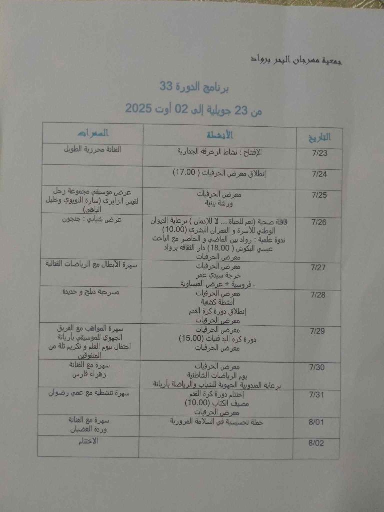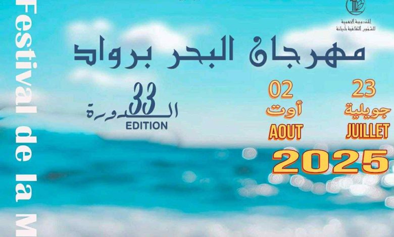 La 33e édition du festival maritime de Raoued se déroulera du 23 juillet au 2 août 2025, avec un programme varié de spectacles, de pièces de théâtre et de divertissements.