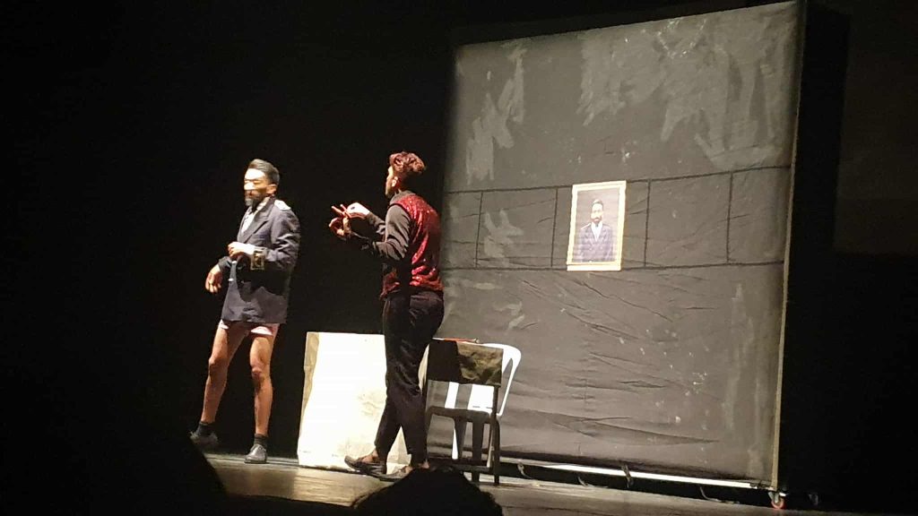 Puis les lumières se rallument et toute l’équipe monte sur scène – Rami Charni, Houssem Mabrouk, Ahmed Hchicha, Hamdi Abd Ejawed, Aymen Khaboushi, Sadok Mzoughiet l’auteur du texte Hatem Hchicha – arborant l’écharpe rouge en solidarité avec les étudiants de l’Institut supérieur des arts dramatiques qui protestent depuis l’ouverture du festival.